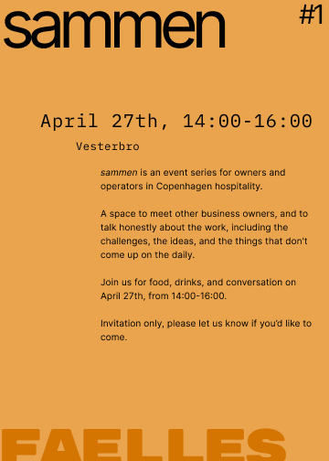 Sammen is an event series for owners and operators in Copenhagen hospitality. A pre-competitive space to meet people running businesses like yours, and to talk honestly about the work, including the challenges, the dreams, and the things that don't come up on the daily.